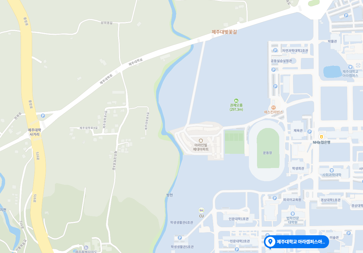 | 캠퍼스안내 | · 제주시 제주대학로 102 (아라일동 1, 제주대학교) 제주대학교 아라컨벤션홀. 세미나실Ⅲ. · 정문 ⇒ 대학본관 ⇒ 학생회관 ⇒ 인문대학 2호환 좌측 아라컨벤션홀 · 정문 ⇒ 대학본관 ⇒ 중앙도서관 ⇒ 교수회관 우측 건물 · 주차요금은 지원되지 않습니다. 대중교통 이용을 부탁드립니다. · 클릭하시면 자세한 지도를 확인하실 수 있습니다. |