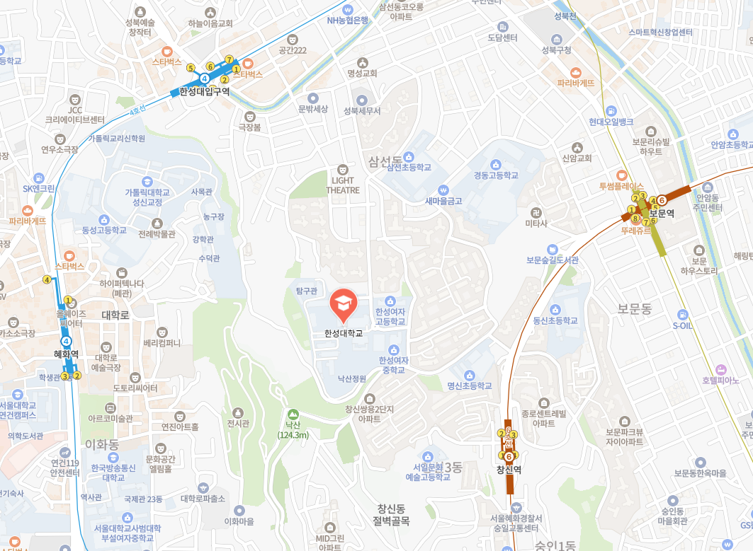 | 캠퍼스안내 | - 주소 : 서울특별시 성북구 삼선교로 16길 116 - 주차 : 기본요금은 30분에 1,500원, 추가요금 10분당 500원, 일 한도 15,000원 입니다. (주차요금은 지원되지 않습니다) * 주차장이 협소하오니 응시자 분들께서는 가능한 대중교통 이용하기기 바랍니다. * 기타사항 : 상상관은 정문에서 약 5분 거리에 있습니다. * 유의사항 : 주말 교통 혼잡등이 예상되므로, 이동시간을 충분히 감안하여 출발하시기 바랍니다 · 클릭하시면 자세한 지도를 확인하실 수 있습니다. |